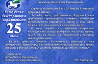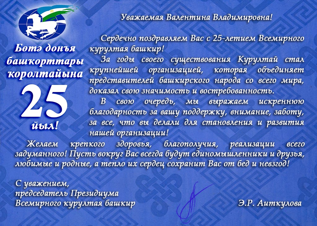 От души поздравляю Международный союз общественных объединений «Всемирный курултай (конгресс) башкир» с юбилеем и желаю дальнейшей плодотворной работы и успеха в благородном деле сохранения и развития башкирского языка и культуры, поддержании мира и дружбы между народами, пропаганде богатого культурного и научного наследия башкирского народа в мире!