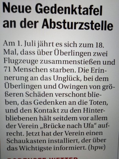 Сегодня члены общества «Мост дружбы Уфа-Бодензее» г.Юберлинген (Германия) поделились фотографиями о проведении траурной церемонии, посвященной 18-ой годовщине трагедии над Боденским озером. Большое спасибо всем нашим немецким друзьям и коллегам за верную память! Вы - супер!
