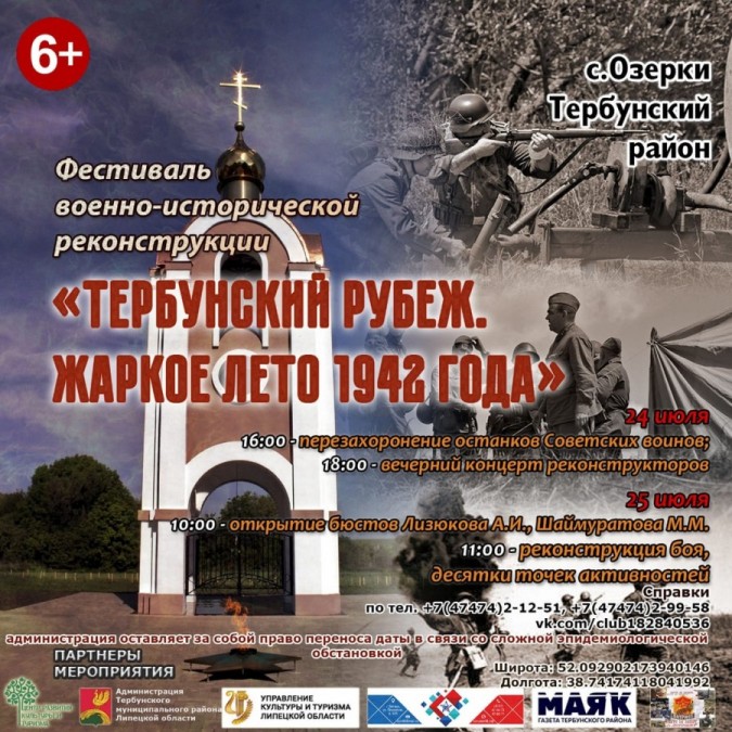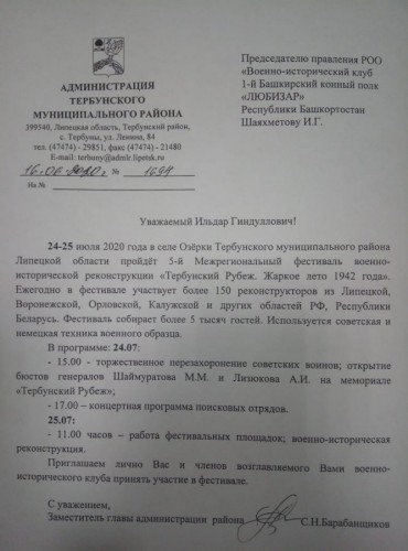По приглашению Администрации Тербунского района Липецкой области активисты и члены Региональной общественной организации Военно-исторического клуба "1-й Башкирский конный полк" - "Любизар" в количестве 6 человек 21 июля 2020 года отправились в Липецкую область для участия в Фестивале "Тербунский рубеж. ЖАРКОЕ ЛЕТО 1942".