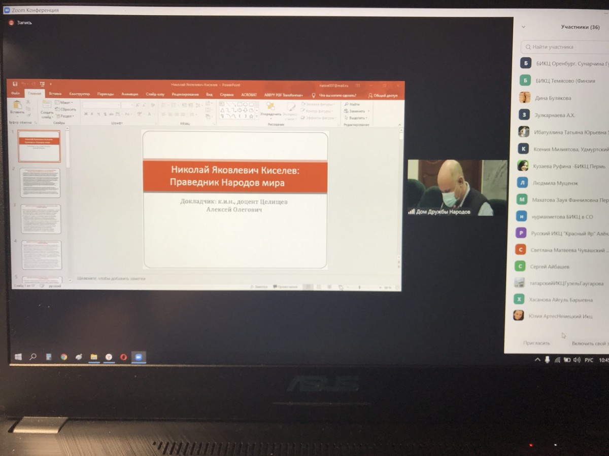 Кандидат исторических наук, доцент кафедры зарубежной истории Института истории и государственного управления БашГУ Алексей Целищев подготовил выступление на тему «Праведник народов мира Николай Яковлевич Киселев», сделав упор на педагогическое измерение подвига.