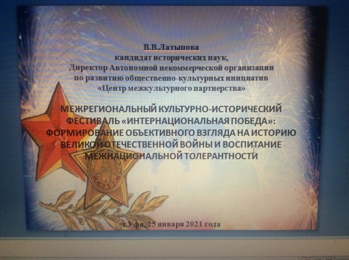 Директор Автономной некоммерческой организации по развитию общественно-культурных инициатив «Центр межкультурного партнерства» Валентина Латыпова представила на круглом столе проект «Межрегиональный культурно-исторический фестиваль «Интернациональная Победа», реализуемый на средства гранта Главы Республики Башкортостан Р.Ф.Хабирова на развитие гражданского общества