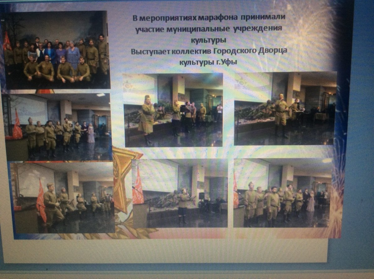 С сентября по октябрь месяц 2020 года в рамках марафона прошло 7 презентаций национально-культурных центров из 10 запланированных. Об участии своих народов в Великой Отечественной войне рассказали представители историко-культурных центров и национально-культурных организаций, представляющие башкирский, русский, татарский, чувашский, кряшенский, марийский, удмуртский, мордовский, белорусский, украинский, польский, туркменский, кыргызский, таджикский, узбекский народы.