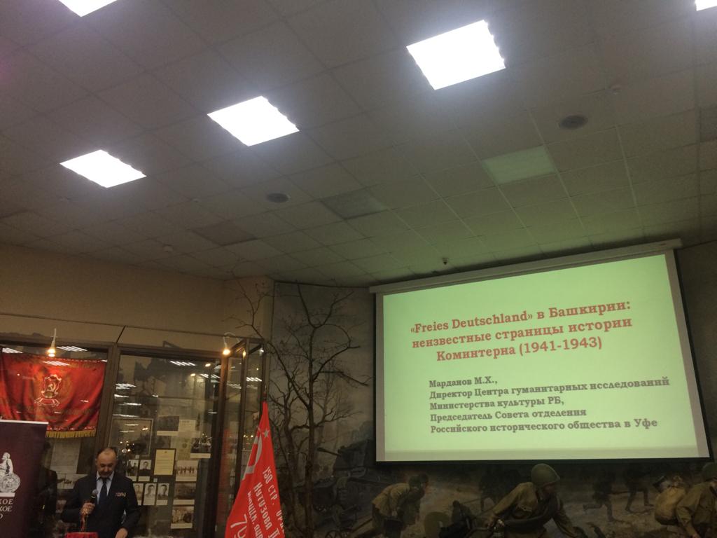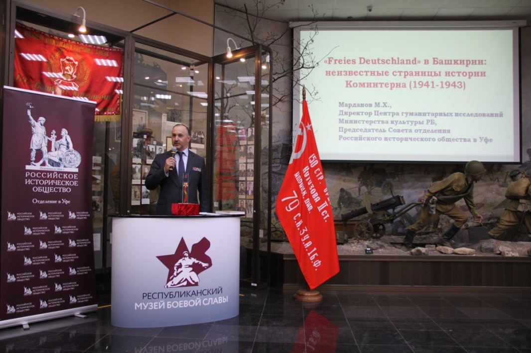 С информацией о новых ранее неизвестных широкой аудитории страницах истории Коминтерна 1941-1943 годов, в частности о представителях немецкого народа, выступил кандидат политических наук, член-корреспондент Академии военных наук, полковник в запасе, директор Центра гуманитарных исследований Министерства культуры Республики Башкортостан, председатель Совета Отделения Российского исторического общества в Уфе Марданов Марат Хамитьянович.