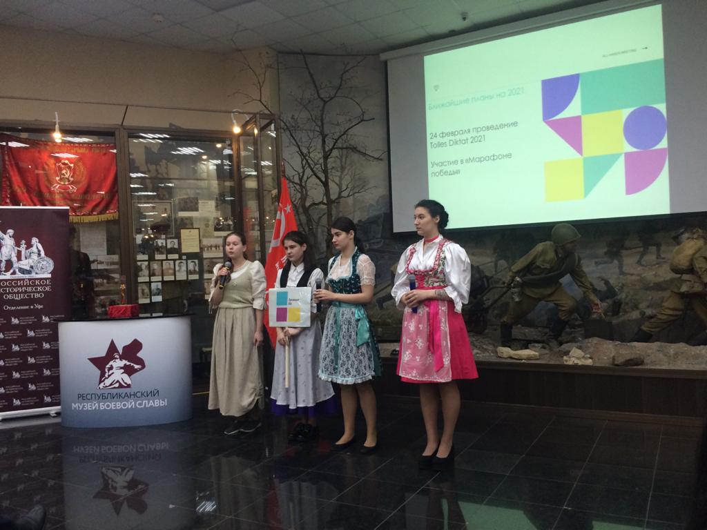 19 марта 2021 года в Республиканском музее Боевой Славы Министерства культуры Республики Башкортостан в рамках Межрегионального культурно-исторического марафона «Интернациональная Победа», проводимого в ходе реализации гранта Главы Республики Башкортостан на развитие гражданского общества, состоялась презентация Общественной организации латышей Республики Башкортостан, Культурно-просветительского союза немцев Республики Башкортостан «Видергебурт», Еврейской общественной организации «Кохав» Республики Башкортостан, Общества греков «Ксимерома» Республики Башкортостан, Азербайджанского национально-культурного центра Республики Башкортостан, Латышского и Немецкого историко-культурных центров – филиалов Дома дружбы народов Республики Башкортостан, посвященная участию народов в Великой Отечественной и Второй мировой войне.