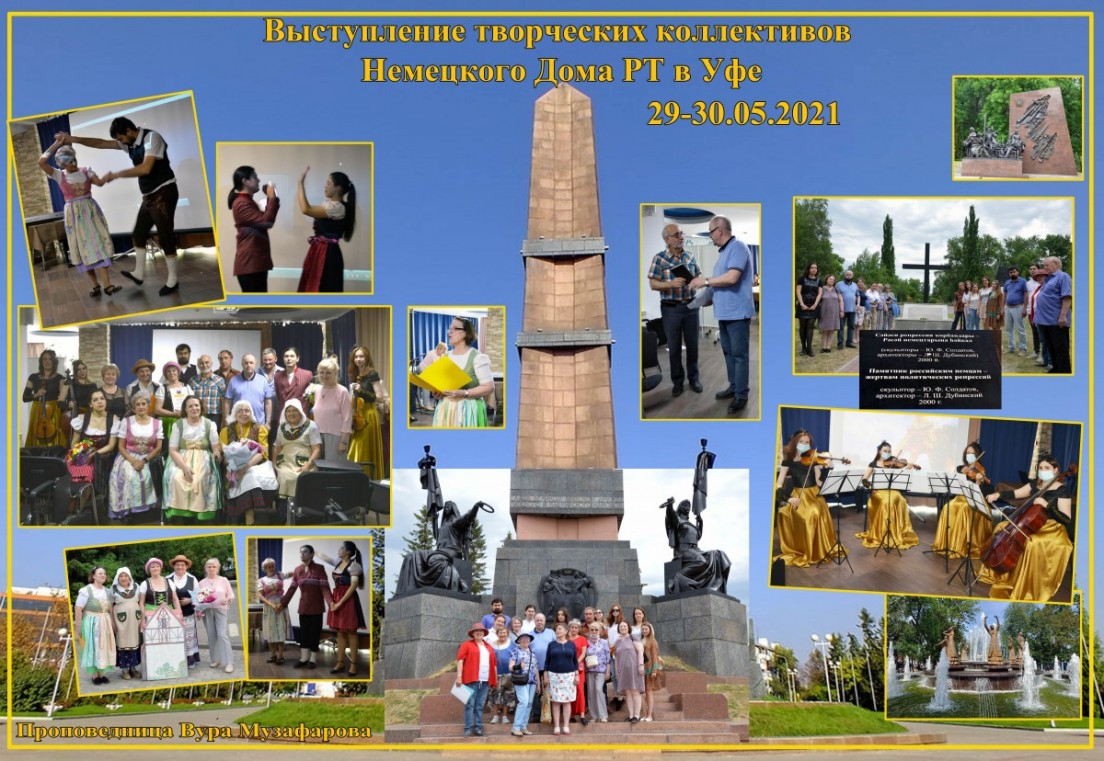 29-30 мая 2021 года творческие коллективы Немецкого Дома Республики Татарстан выезжали в столицу Башкортостана город Уфу, в гости к нашим соплеменникам, российским немцам Башкортостана в рамках согласованного с МКС – Межрегиональным координационным советом российских немцев Поволжья и Юго-Запада России – проекта, при поддержке Международного союза немецкой культуры. В этнокультурном десанте «Казань-Уфа» принял участие 21 человек, в том числе 13 российских немцев. Концертную программу составил 22 номера трёх солистов и трёх творческих коллективов.