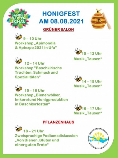 Партнеры проекта в Германии - общество «Мост дружбы Уфа-Бодензее» готовят выставки о сотрудничестве с Республикой Башкортостан, презентации, концерт, представляющий русское, башкирское и немецкое народное творчество. В рамках фестиваля общество проведет также Панельную дискуссии «Пчелы, цветы и хороший урожай», в которой в онлайн-формате примут участие ученые и пчеловоды Башкортостана.