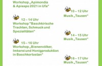 Башкортостан – исключительный регион для развития пчеловодства. Башкирский мед по своим целебным и вкусовым качествам не имеет аналогов в мире. На этнокультурной площадке фестиваля будет представлена фотовыставка продуктов пчеловодства, информация о Башкирском научно-производственном центре по пчеловодству и апитерапии и о проведении в 2022 году в г.Уфе Международного конгресса пчеловодов "Апимондия" - площадки для научного обсуждения проблем развития пчеловодства, обмена опытом, новыми технологиями производства и переработки меда.