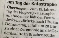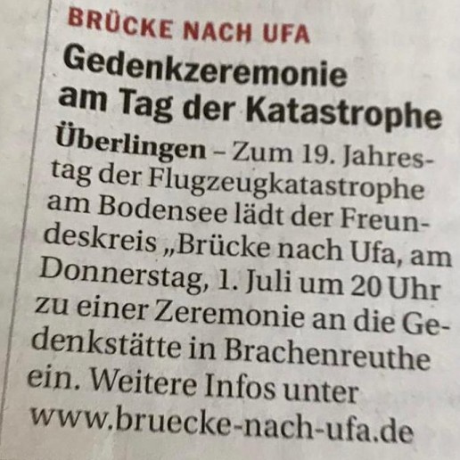 в ночь с 1 на 2 июля 2002 года в небе над Боденским озером столкнулись два самолёта — пассажирский лайнер «Башкирских авиалиний» и грузовой Boeing. В результате катастрофы погиб 71 человек, из них — 52 ребёнка.