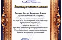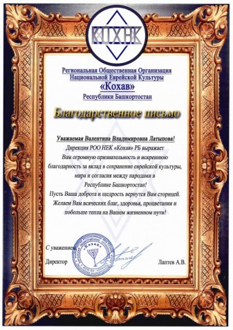 Дирекция Региональной общественной организации Национальной Еврейской Культуры «Кохав» Республики Башкортостан выражает признательность и искреннюю благодарность Латыповой Валентине Владимировне за вклад в сохранение еврейской культуры, мира и согласия между народами в Республике Башкортостан.