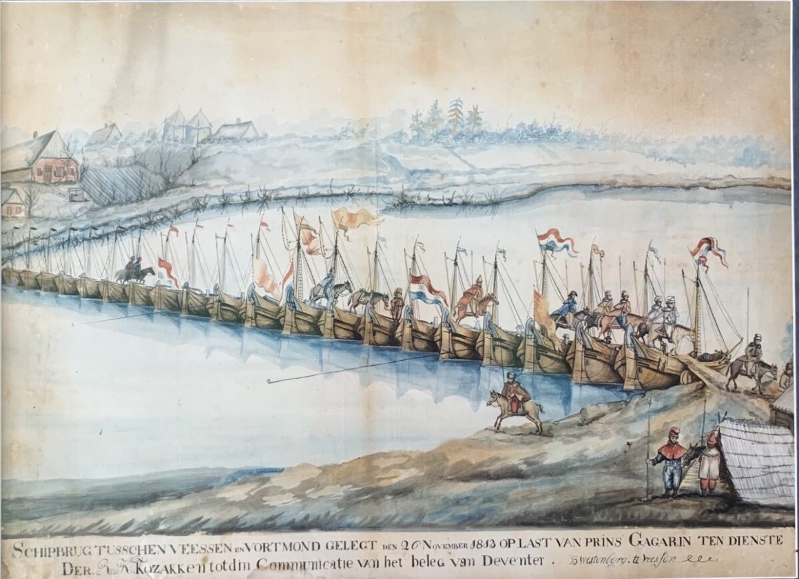4. Schipbrug tussen Wijhe en Veessen, afgebeeld door Barend Westenberg, Veessen november 1813, onlangs bekend geworden, uit particulier bezit.