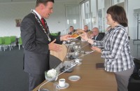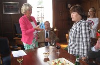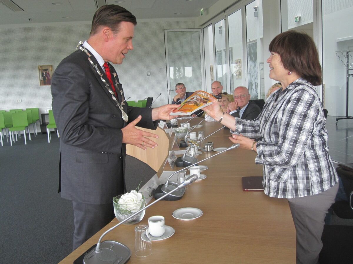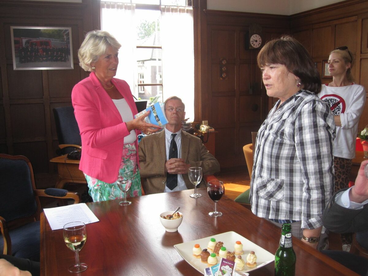 7. Bashkierse delegatie bezoekt Nederland. Lnks: ontvangst door burgemeester van Heerde Inez Pijnenburg en Venera Farganova. Rechts: Burgemeester van Wijhe Ton Strien en Venera Farganova wisselen geschenken uit, 7 juli 2014.