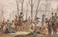 3. Links: Amsterdammers komen kijken naar het Kozakken- en Basjkierenkampement bij de Muiderpoort, waar wordt gedanst en een vuurtje gestookt. Rechts: Basjkierse ruiters op het Lange Voorhout in Den Haag (de stenen pomp staat er nog steeds).