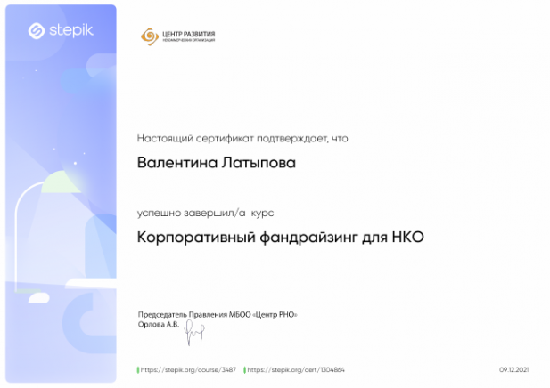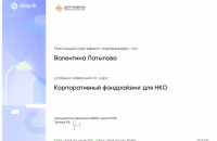 Директор Автономной некоммерческой организации по развитию общественно-культурных инициатив "Центр межкультурного партнерства" Валентина Латыпова прошла курс "Корпоративный фандрайзинг для НКО: как привлечь средства компании на социальные цели" и получила сертификат.