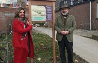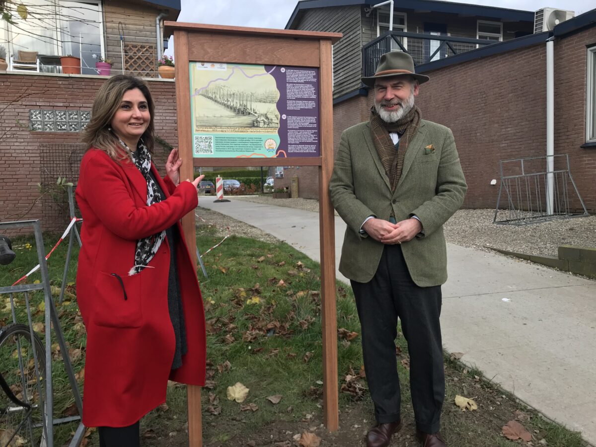 2. Veessen: links: Wethouder Yasemin Cegerek installeert informatiebord over het Basjkierse ruitermonument en de Schipbrug, rechts initiatiefnemer Jurn Buisman