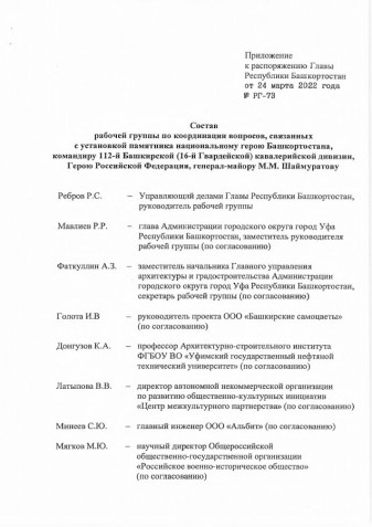 Директор АНО ПРОКИ «Центр межкультурного партнерства» Валентина Латыпова распоряжением Главы Республики Башкортостан Р.Хабирова № РГ-73 от 24 марта 2022 года включена в состав рабочей группы по координации вопросов, связанных с установкой памятника национальному герою Башкортостана, командиру 112-й Башкирской (16-й Гвардейской) кавалерийской дивизии, Герою Российской Федерации, генерал-майору М.М.Шаймуратову.