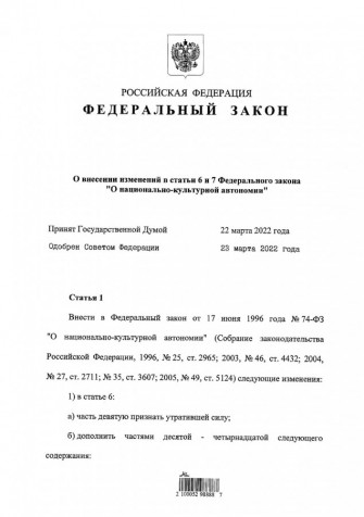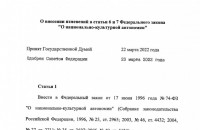 Президентом Российской Федерации подписан Федеральный закон от 1 апреля 2022 г. № 89-ФЗ «О внесении изменений в статьи 6 и 7 Федерального закона «О национально-культурной автономии».