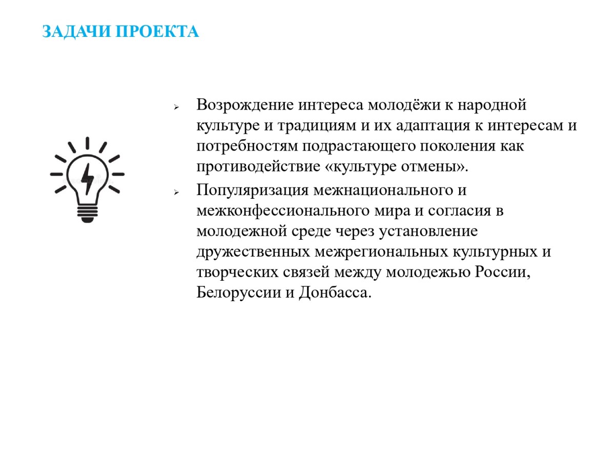 - Популяризация межнационального и межконфессионального мира и согласия в молодежной среде через установление дружественных межрегиональных культурных и творческих связей между молодежью России, Белоруссии и Донбасса
