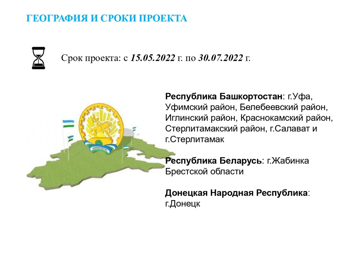 Республика Башкортостан: г.Уфа, Уфимский район, Белебеевский район, Иглинский район, Краснокамский район, Стерлитамакский район, г.Салават и г.Стерлитамак, Республика Беларусь: г.Минск и г.Жабинка Брестской области, г.Донецк Донецкой Народной Республики