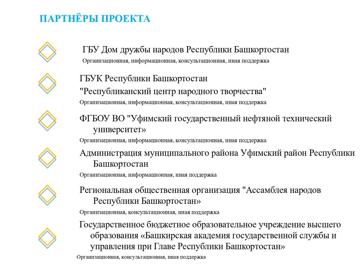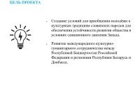 - Развитие международного культурно-гуманитарного сотрудничества между Республикой Башкортостан Российской Федерации и регионами Республики Беларусь и Донбасса