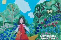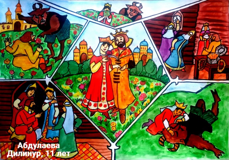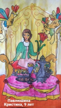 Абдулаева Дилинур, 12 лет, с.Бойтуб Кушрабатский район Самаркандская область Республика Узбекистан Общеобразовательная школа № 68. Благотворительный кружок изобразительного искусства при собственном Доме-Музее художника-педагога на пенсии Бегматова Музаффара Тоштемировича. Авторское название работы «Иллюстрация к сказке «Аленький цветочек». Руководитель – Бабанова Гулсум Абдиевна;