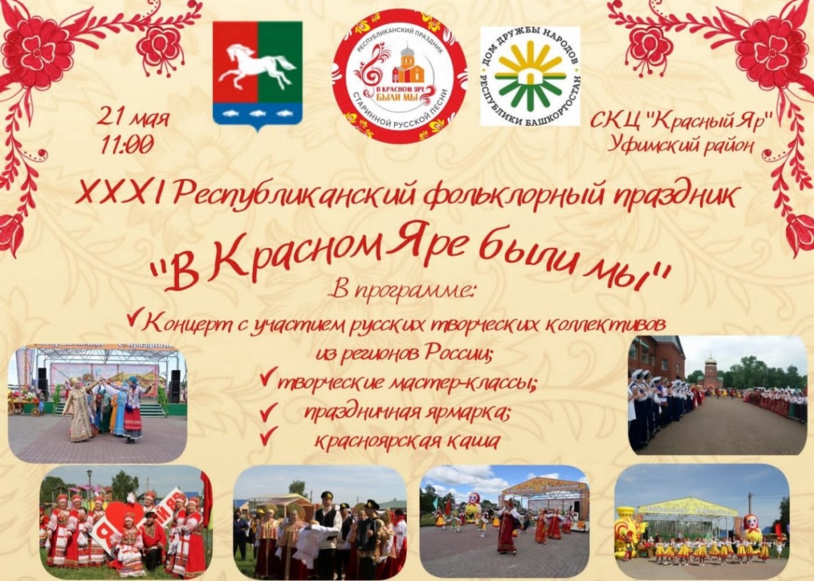 21 мая 2022 года в селе Красный Яр Уфимского района прошел XXXI республиканский праздник старинной русской песни «В Красном Яре были мы» в рамках Дней славянской письменности и культуры. Организаторами праздника выступили ГБУ Дом дружбы народов Республики Башкортостан, Администрация МР Уфимский район, РОО Собор русских Республики Башкортостан.