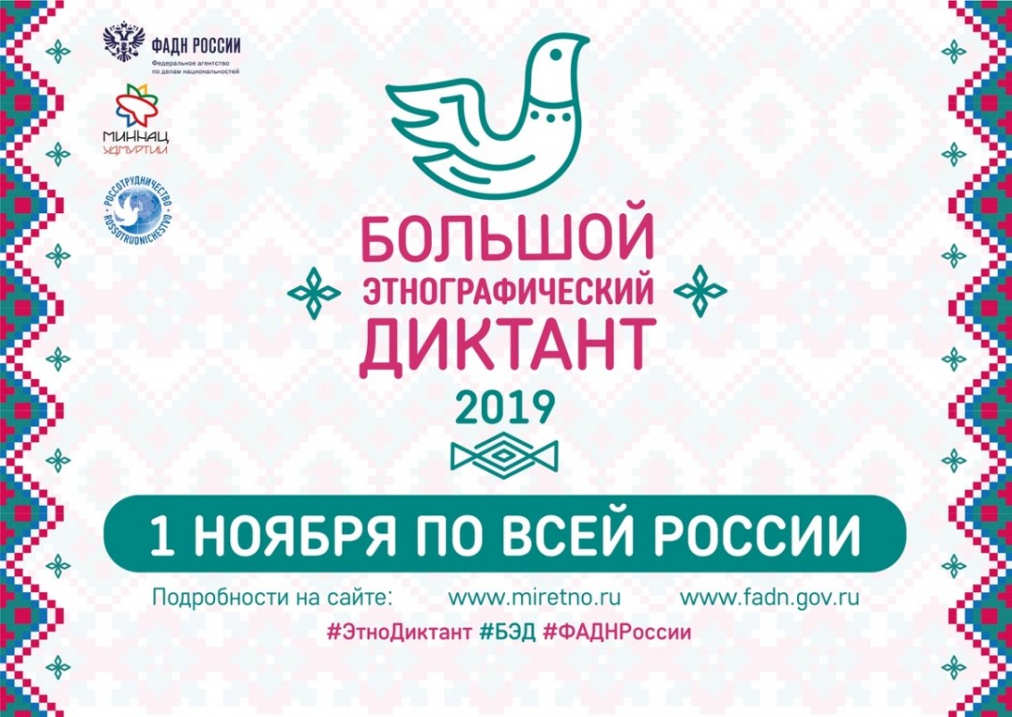 Международная акция «Большой этнографический диктант» состоялась 1 ноября 2019 года в 85 субъектах Российской Федерации и в 42 зарубежных странах. Мероприятие прошло накануне Дня народного единства.