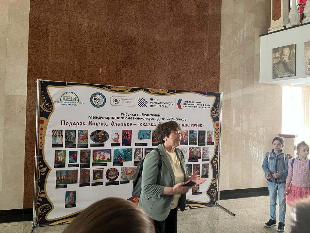 25 мая 2022 года в Государственном академическом русском драматическом театре Республики Башкортостан состоялась презентация выставки работ победителей Международного онлайн-конкурса детских рисунков «Подарок Внучке Оленьке - сказка Аленький цветочек», проведенного при содействии Президентского фонда культурных инициатив. Презентацию ведет главный специалист Русского историко-культурного центра "Красный Яр" Венера Фарганова.