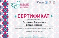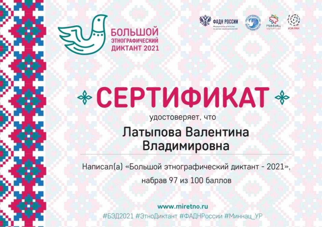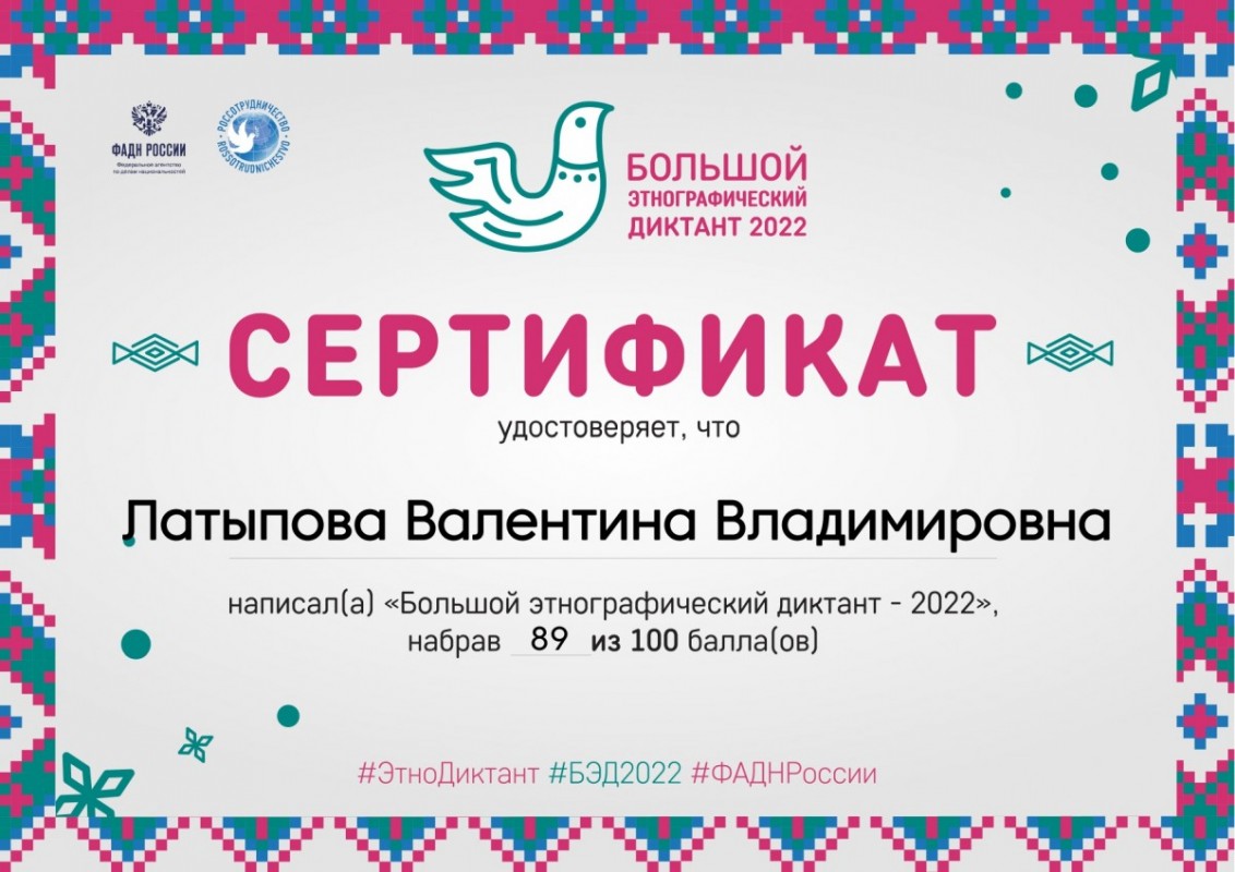 Директор Автономной некоммерческой организации по развитию общественно-культурных инициатив «Центр межкультурного партнерства» Валентина Латыпова приняла участие в "Большом этнографическом диктанте - 2022" и набрала 89 баллов. В прошлом году результат был лучше – 97 баллов.
