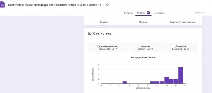 Из-за рубежа в тестировании на вопросы анкеты «Kenntnistest «Auslandsfeldzüge der russischen Armee 1813-1814 Jahre» по ссылке: https://docs.google.com/forms/d/1F_oF4_cZ80jQ6gS_wHNXUaWSEWTUEc9cKCX_dPInd50/edit приняли участие 19 человек.