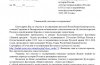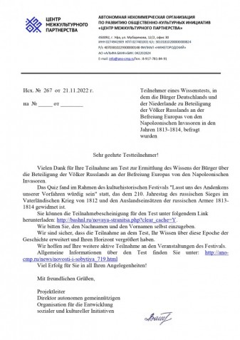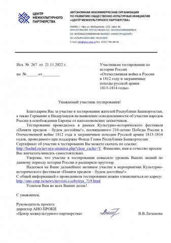 В рамках Культурно-исторического фестиваля «Памяти предков – будем достойны!», посвященного 210-летию Победы России в Отечественной войне 1812 года и заграничным походам Русской армии 1813-1814 годов, проводимого при поддержке Фонда Главы Республики Башкортостан, Автономная некоммерческая организация по развитию общественно-культурных инициатив «Центр межкультурного партнерства» и Национальная библиотека имени А.-З. Валиди Республики Башкортостан провели тестирование членов целевых групп проекта – участников фестиваля на выявление осведомленности населения Республики Башкортостан об участии народов России в освобождении Европы от наполеоновских захватчиков.