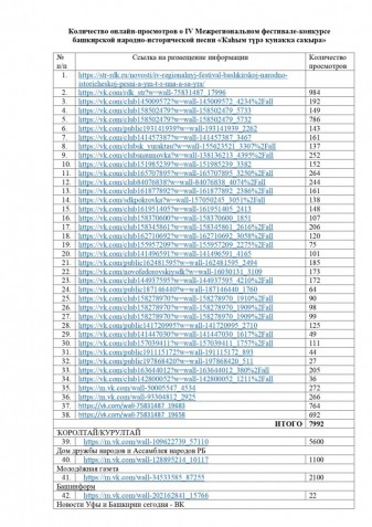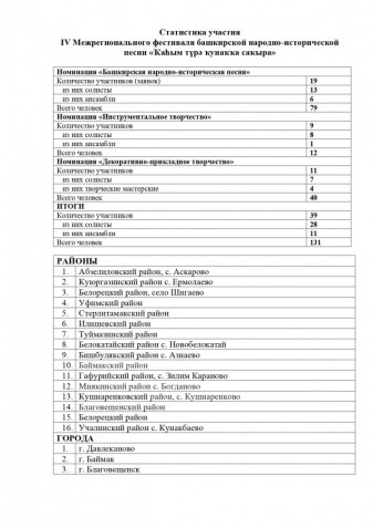 В фестивале приняли участие 131 человек из 16 районов и 3 городов Республики Башкортостан. Среди участников жюри выбрало 38 победителей (коллективов и отдельных исполнителей). Количество зрителей (онлайн-просмотров) – не менее 26165 человек.