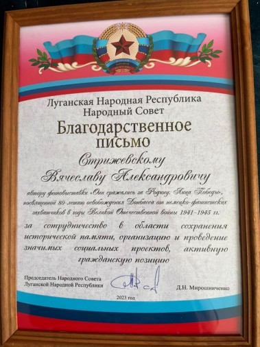Фотовыставка «Они сражались за Родину. Лица Победы», посвящённая 80-летию освобождения Донбасса, известного фотокорреспондента Вячеслава Стрижевского, подготовленная в рамках проекта «Историко-мемориальная экспедиция «По следам мужества и славы: эстафета поколений», реализуемого Автономной некоммерческой организацией по развитию общественно-культурных инициатив «Центр межкультурного партнерства» при поддержке Фонда президентских грантов, была передана школе от имени автора.