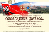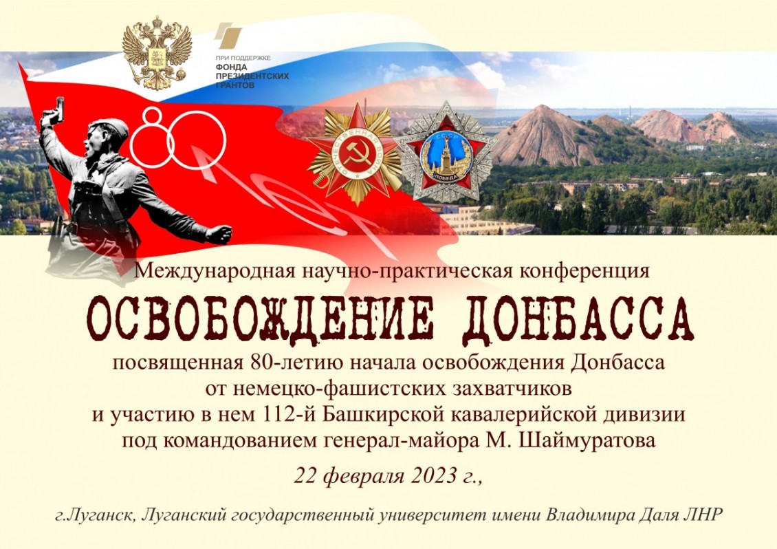 В 15.30 часов в Луганском государственном университете имени Владимира Даля начнет работу Международная научно-практическая конференция «Освобождение Донбасса», посвященная 80-летию начала освобождения Донбасса от немецко-фашистских захватчиков в годы Великой Отечественной войны. В студенческой среде пройдет просмотр и обсуждение документального фильма о легендарном командире 112-й Башкирской (16-й Гвардейской) кавалерийской дивизии, генерале Минигали Мингазовиче Шаймуратове «Легенды армии: Минигали Шаймуратов», снятого российским телеканалом «Звезда».
