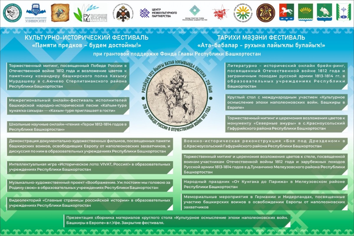В рамках культурно-исторического фестиваля «Памяти предков – будем достойны!», проводимого при поддержке гранта Главы Республики Башкортостан, Институт истории и государственного управления Уфимского университета науки и технологий, АНО по развитию общественно-культурных инициатив «Центр межкультурного партнерства», Национальная библиотека имени А.-З.Валиди Республики Башкортостан, Региональное отделение Российского военно-исторического общества в Республике Башкортостан проводят 14 апреля 2023 года Международный круглый стол «Культурное осмысление эпохи наполеоновских войн. Башкиры в Европе».