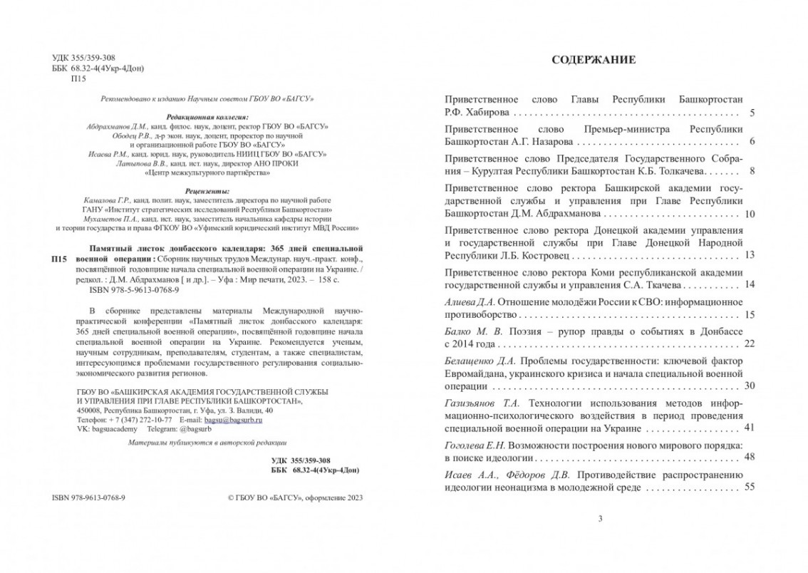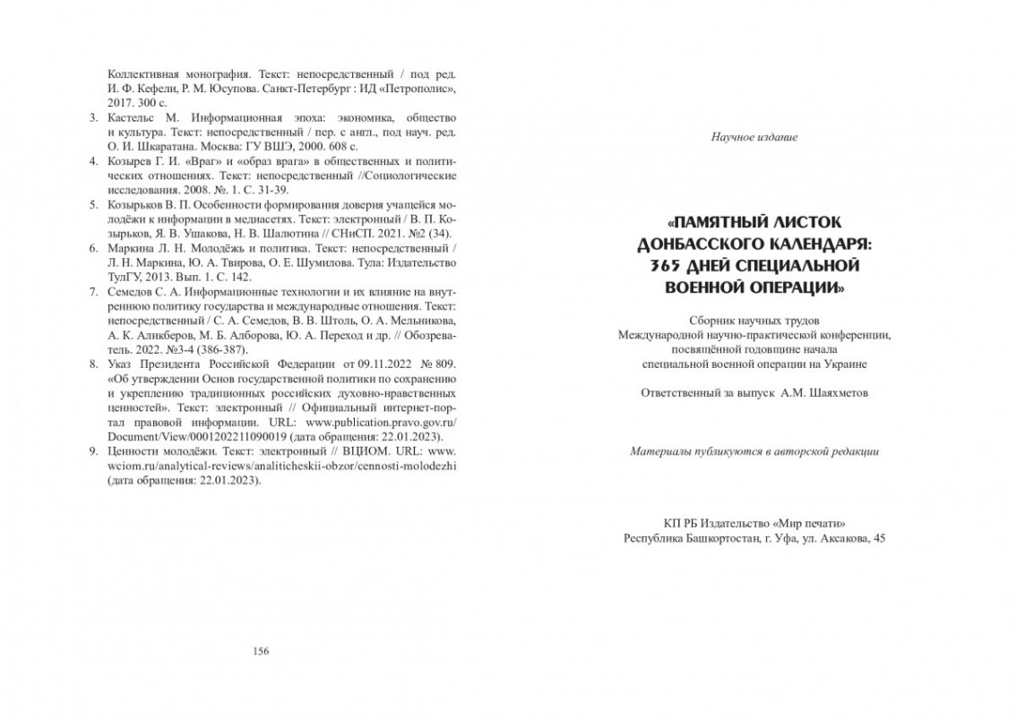 В издательстве «Мир печати» (г.Уфа) опубликован сборник «Памятный листок донбасского календаря: 365 дней специальной военной операции: Сборник научных трудов Международной научно-практической конференции, посвящённой годовщине начала специальной военной операции на Украине Освобождение Донбасса.