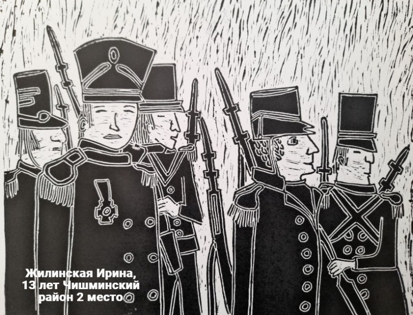 Жилинская Ирина, 13 лет, «Отважные сыны», линогравюра, ДШИ Чишминского района, преподаватель - Хабибуллина Эльвира Саитгалиевна