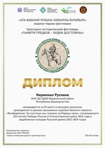 В Республике Башкортостан в рамках культурно-исторического фестиваля «Памяти предков – будем достойны!», проводимого при поддержке Фонда Главы Республики Башкортостан, реализован музыкально-художественный проект «Воображение. Уж постоим мы головою за Родину свою», посвященный 210-летию Победы России в Отечественной войне 1812 года и зарубежным походам Русской армии 1813-1814 годов.