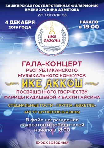 4 декабря 2019 году в Башкирской государственной филармонии им. Х. Ахметова прошёл Гала-концерт победителей ежегодного Республиканского конкурса-фестиваля «Ике аккош» («Два лебедя»). Традиционный музыкальный проект посвящен творчеству заслуженной артистки Российской Федерации, народной артистки Российской Федерации, анодной артистки Башкортостана и Татарстана Фариды Ягудовны Кудашевой и народного артиста БАССР, заслуженного артиста РСФСР Бахти Гайсина.