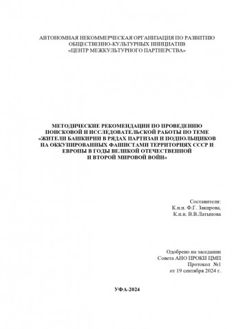 Методические рекомендации по проведению поисковой и исследовательской работы по теме «Жители Башкирии в рядах партизан и подпольщиков на оккупированных фашистами территориях СССР и Европы в годы Великой Отечественной и Второй мировой войн» разработаны к.и.н., заместителем начальника отдела генеалогии, публикационной и издательской работы Национального архива Республики Башкортостан Ф.Г.Закировой и к.и.н., директором АНО ПРОКИ «Центр межкультурного партнерства» В.В. Латыповой.
