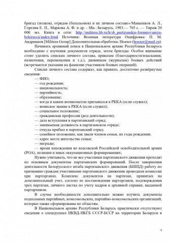 Начинать архивный поиск в Национальном архиве Республики Беларусь необходимо с изучения документов отряда, затем бригады. Особое внимание стоит уделить спискам личного состава, приказам (благодарности/взыскания, назначения, перемещения и т.д.), дневникам (журналам) боевых действий (встречаются указания на фамилии участников боевых операций).