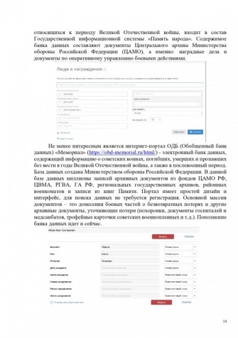 Не менее интересным является интернет-портал ОДБ (Обобщенный банк данных) «Мемориал» (https://obd-memorial.ru/html/) - электронный банк данных, содержащий информацию о советских воинах, погибших, умерших и пропавших без вести в годы Великой Отечественной войны, а также в послевоенный период. База данных создана Министерством обороны Российской Федерации. В данной базе данных миллионы записей архивных документов из фондов ЦАМО РФ, ЦВМА, РГВА, ГА РФ, региональных государственных архивов, районных военкоматов и записи из книг Памяти. Портал имеет простой дизайн и интерфейс, для поиска данных не требуется регистрация. Основной массив документов – это донесения боевых частей о безвозвратных потерях и другие архивные документы, уточняющие потери (похоронки, документы госпиталей и медсанбатов, трофейные карточки советских военнопленных и т.д.). Пополнение банка данных идет и сейчас.