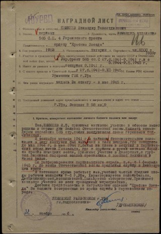 Достоин представления к награждению орденом «Красная Звезда» за подвиги, совершенные во время службы в партизанском отряде.». Документ датирован 21 ноября 1956 года. https://clck.ru/3EDUb2
