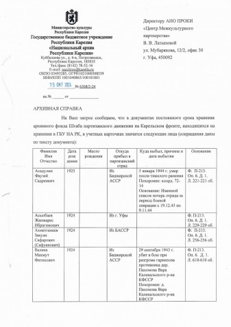 Из Национального архива Республики Карелия по запросу Автономной некоммерческой организации по развитию общественно-культурных инициатив «Центр межкультурного партнерствах» поступила информация о 12 участниках Великой Отечественной войны из Башкирии - участниках партизанского движения на Карельском фронте.