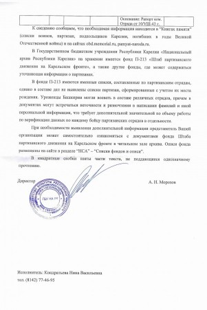 Организаторы проекта искренне благодарят директора Национального архива Республики Карелия Александра Николаевича Морозова и сотрудников архива за поиск информации в фондах архива. Предоставленные архивные сведения о наших земляках — участниках партизанского движения на территории Республики Карелия в годы Великой Отечественной войны существенно пополнят создаваемую базу данных «Фронт в тылу врага» и окажут неоценимую помощь родственникам в поиске сведений о своих родных, а исследователям помогут пополнить историю Башкортостана новыми данными о героизме наших земляков.