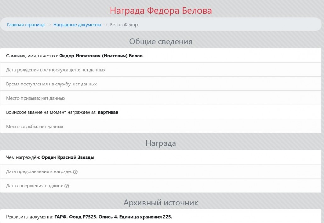 Заведующий архивным отделом Мишкинского района Республики Башкортостан С.В.Александрова предоставила организаторам Историко-просветительского проекта «Жители Башкирии в рядах партизан и подпольщиков в годы Великой Отечественной войны 1941–1945 гг.», реализуемого при поддержке Фонда Главы Республики Башкортостан, анкетные данные Федора Ипатовича Белова.
