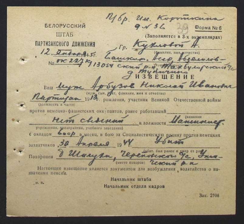 К сожалению, Арбузов Николай Иванович до Победы не дожил – погиб 30.04.1944 г. Первичное место захоронения: Республика Беларусь, Витебская обл., Ушачский район, Череповский с/с, д.Шелуха, так указано в похоронке на имя жены – Кухловой Анны Матвеевны, проживавшей в Абзелиловском районе Ташбулатовском с/с, с. Кусимовский Рудник. В других, более поздних документах, место захоронения указано: Республика Беларусь, Минская область, Молодечнинский район, г.п. Радошковичи, кладбище