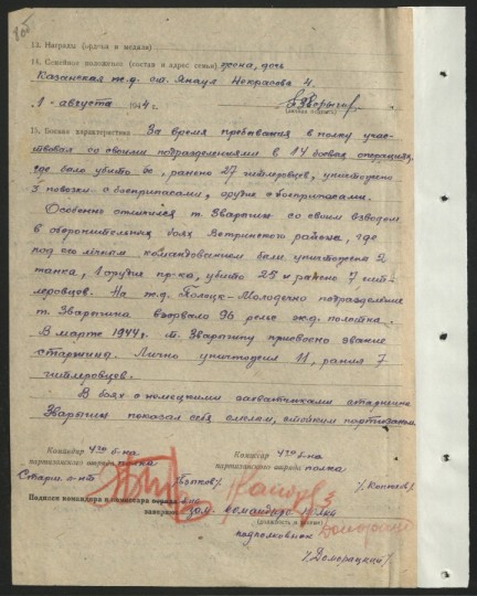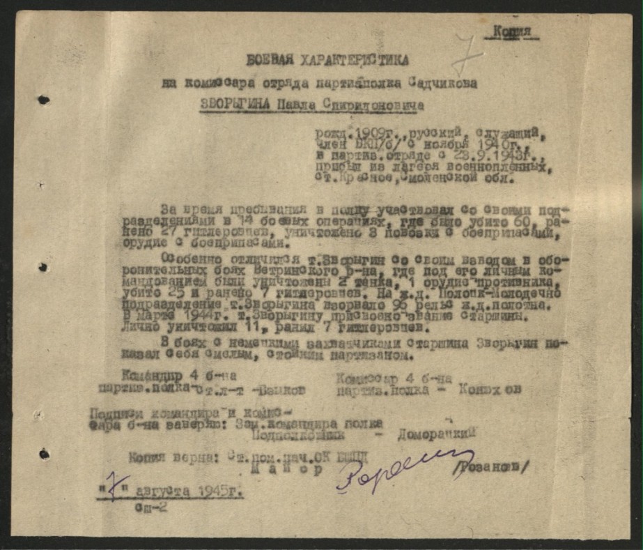 В боях с немецкими захватчиками старшина Зворыгин показал себя смелым, стойким партизаном.» https://partizany.by/partisans/50076/