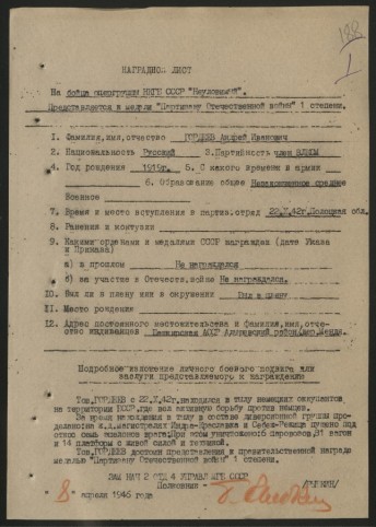 В наградном листе по представлению бойца спецгруппы НКГБ СССР «Неуловимый» Гордеева Андрея Ивановича к медали «Партизану Отечественной войны» 1 степени говорится: