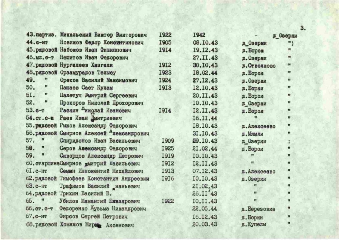 Хабибулин Мурула Сибатович — 1922, татар[ин], б[ес]п[артийный], малогр[амотный], воен[но]обяз[анный], РККА — 47 р., 22.02.[19]43 г., рядовой; Баш[кирская] АССР, Альшеевский р[айо]н, Слаковский с[ельский] c[овет], д. Оклишме (?); 3 души, отец, мать и брат; из Волго-татар[ского] б[атальо]на.