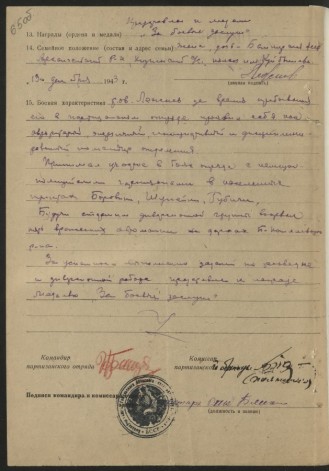 В боевой характеристике Лежнева И.Е., подписанной командиром отряда 13 декабря 1943 г., говорится: “тов. Лежнев за время пребывания в партизанском отряде проявил себя как авторитетный, энергичный, инициативный и дисциплинированный командир отделения. Принимал участие в боях отряда с немецко-полицейскими гарнизонами в населенных пунктах Боровичи, Шупейки, Губичи. Будучи старшим диверсионной группы, взорвал пять вражеских автомашин на дорогах Буда-Кошелёвского района. За успешное выполнение заданий по разведке и диверсионной работе представлен к награде медалью «За боевые заслуги».